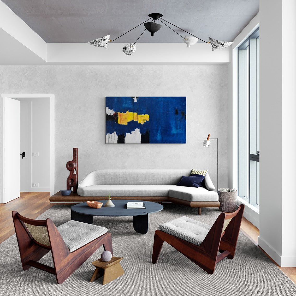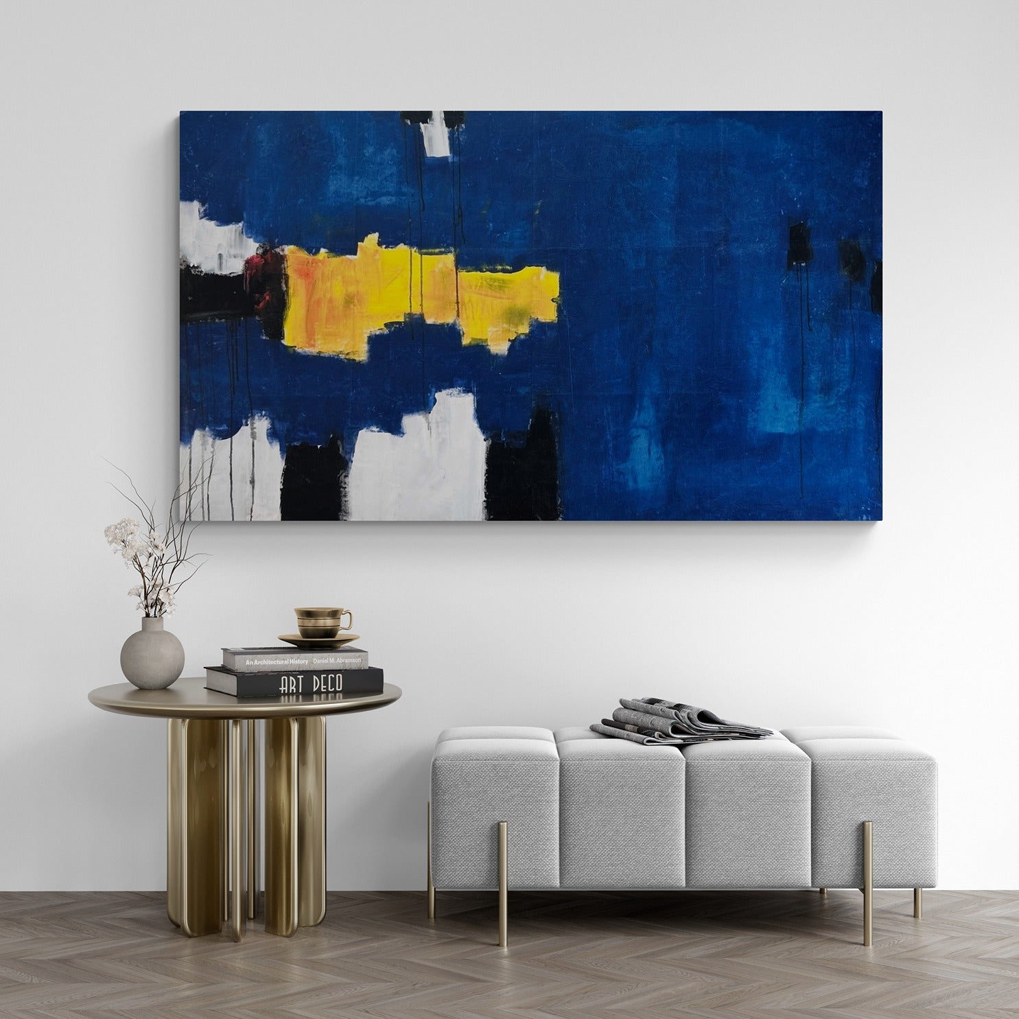 Enhance your space with Core Exposed, an elegantly designed abstract expressionist painting featuring rich blues, vibrant yellows, crisp whites, and bold blacks. This original hand-painted wall art utilizes striking colors and a unique composition that is sure to captivate and inspire depth and relaxation, simultaneously. Elevate your decor and spark conversation among your guests with this imaginative masterpiece.