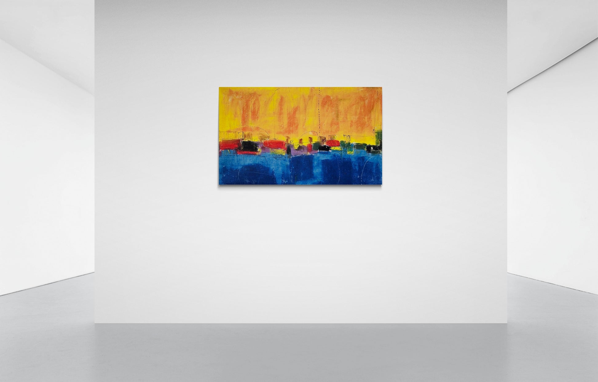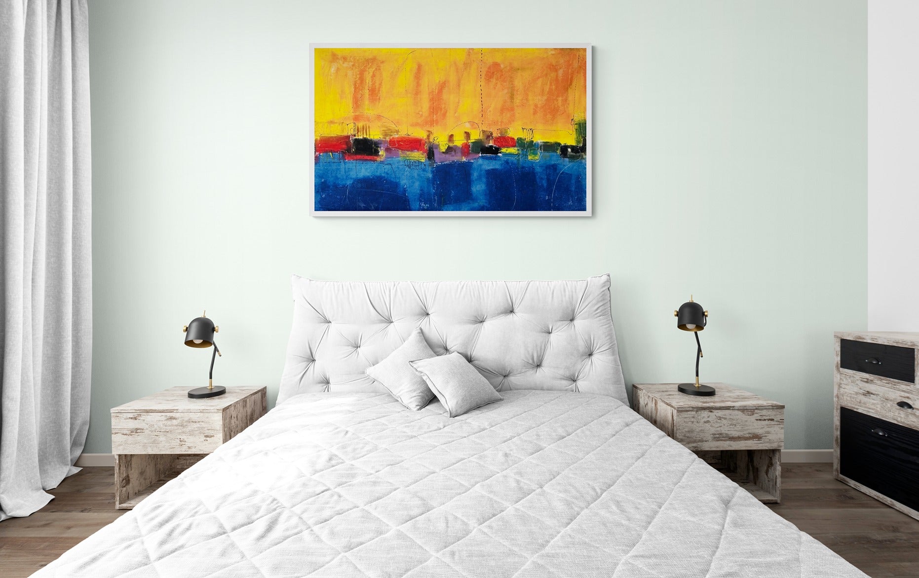 Discover the captivating blend of colors and shapes in Sunset Fusion. This original hand-painted wall art showcases a fusion of sunset and water, creating a mesmerizing visual experience. Let your walls come alive with the serene beauty of this unique piece.