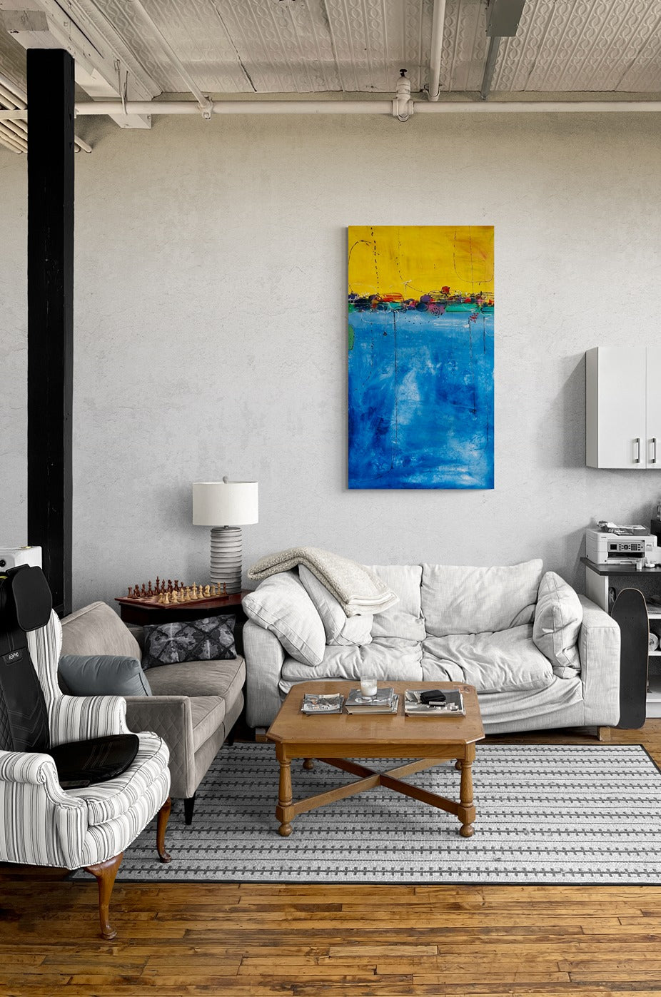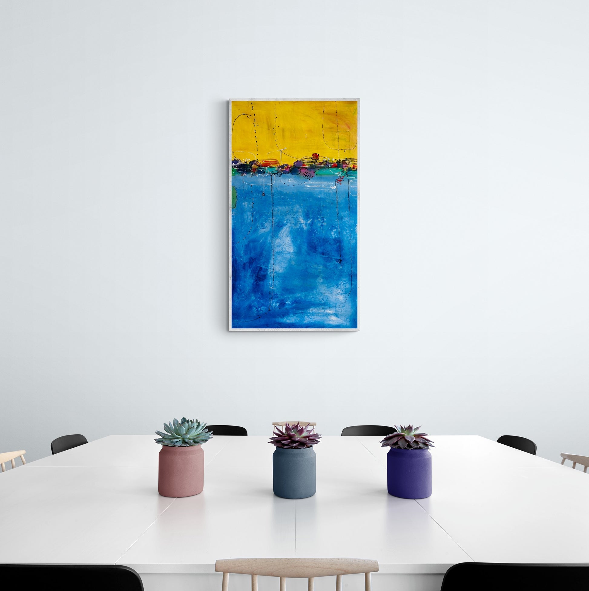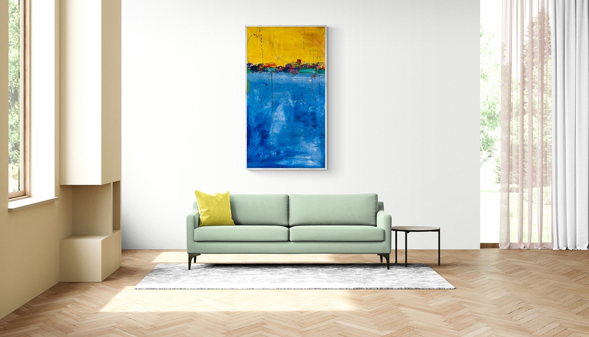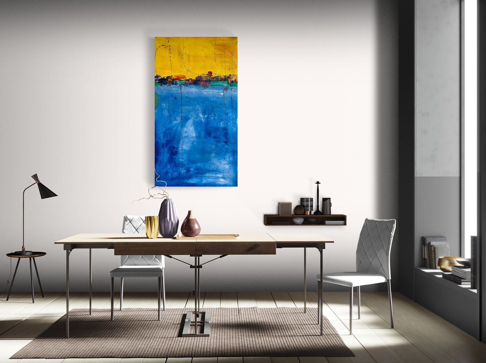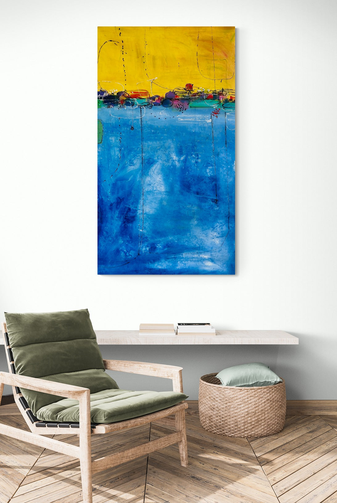 Vita in Filo captures the abstract beauty of the Atlantic Ocean with its dynamic blend of yellow and blue hues. As the sun rises, the vibrant yellow evokes the warm, glowing sky, while the serene blue represents the calm ocean at sunset. This original hand-painted wall art is a perfect addition to any art collection.